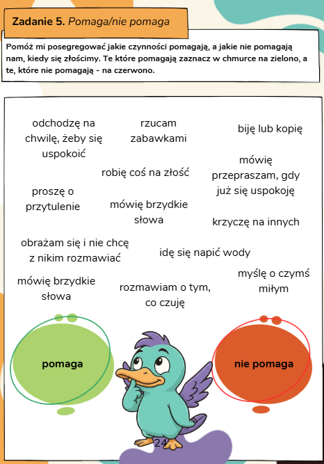 - ilustracje i karty pracy wspierające rozwój emocjonalny,