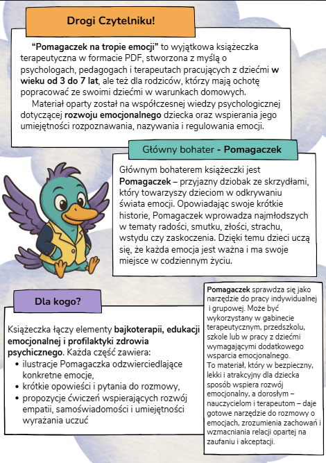 „Pomagaczek na tropie emocji” to wyjątkowa seria historyjek terapeutycznych, stworzona z myślą o psychologach, pedagogach, terapeutach oraz rodzicach, którzy chcą wspierać dzieci w odkrywaniu i rozumieniu świata emocji.