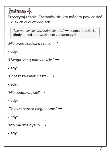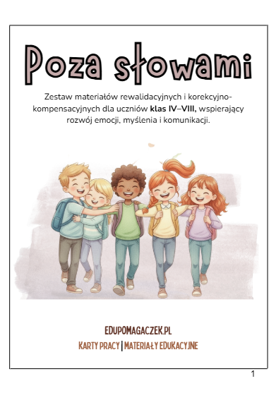 🌿„Poza słowami” to kompleksowy zestaw ćwiczeń wspierających rozwój emocjonalny, poznawczy i komunikacyjny starszych uczniów. Stworzony z myślą o pracy indywidualnej i grupowej, pomaga dzieciom z trudnościami w nauce, zaburzeniami komunikacji, trudnościami emocjonalnymi oraz deficytami uwagi i pamięci.