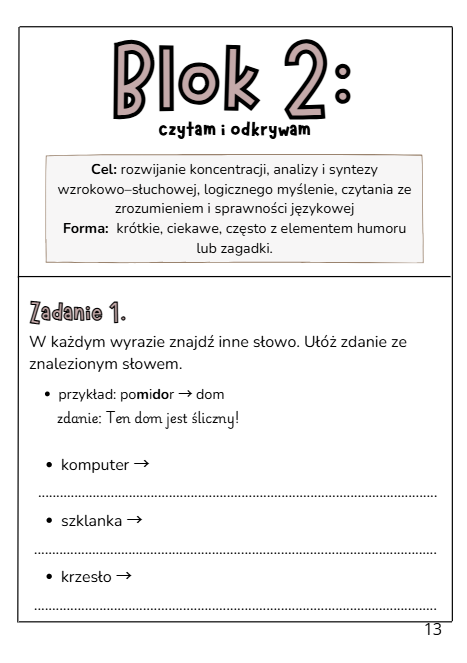 📘 Blok 2 wspiera koncentrację, analizę i syntezę wzrokowo-słuchową, logiczne myślenie, czytanie ze zrozumieniem i sprawność językową.